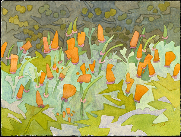 Eschscholzia californica, is a botanical native to California. In the late 1700s, Spanish colonists called the poppy “copa de oro,” which translates in English to “cup of gold.” In the mid-1800s, California was a part of the United States of America, and they became known as “California Poppy.” They are nyctinastic, closing at night and on rainy days. Backyard Poppies depicts the California Poppies that have naturalized in my home garden. Because of the rainy weather, I looked out the window to paint the poppies’ buds, flowers, and seedpods.