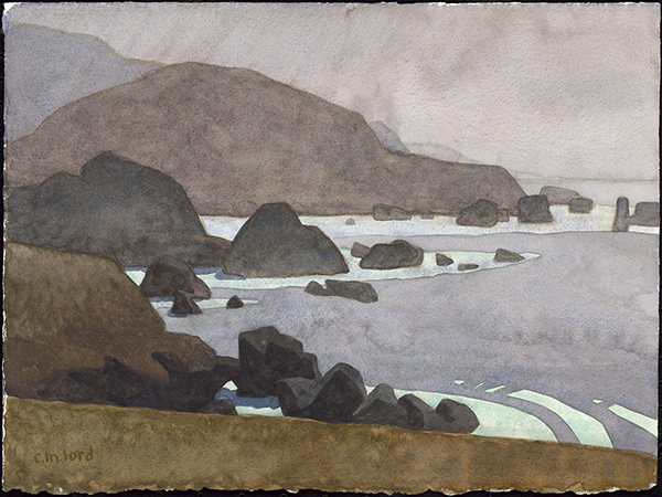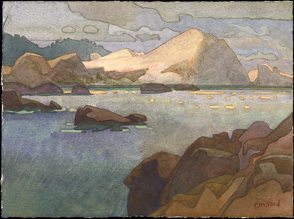 Bird Island is in Point Lobos, a nature preserve along California’s Pacific Coast. Vista to Bird Island depicts a rookery for pelicans and cormorants. On the island, these ground-nesting birds are protected from land-based predators. Viewed from a distance, this guano-covered island has a spectral quality.