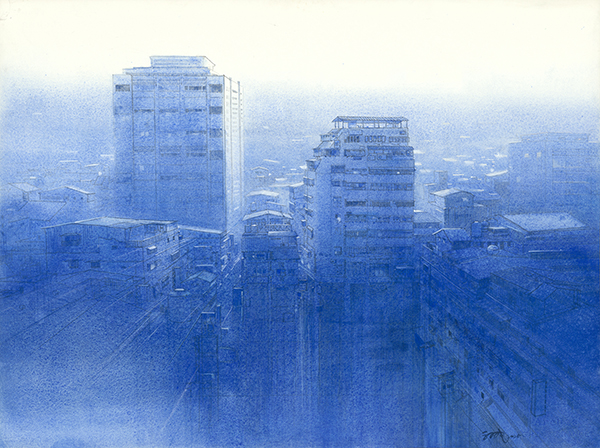 用單一藍色調描繪都市景象,不追求華麗或劇烈的變化,而是在繁複的結構中找到一種純粹。