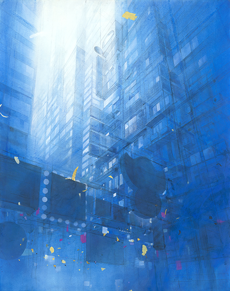The cityscape is depicted in a single shade of blue. Rather than pursuing splendor or dramatic change, it seeks purity amidst intricate structures.