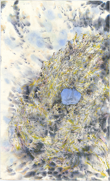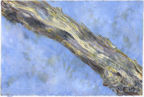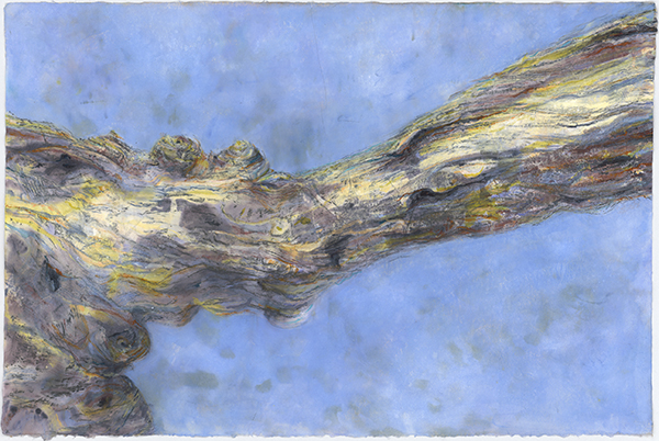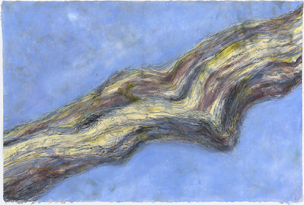 The third artwork, In the Arms of The General 3 (right), shows the linear undulations of the bark as it flows back up the trunk of the gumtree. Wanting to continue with the organic approach to making these artworks, the artist began adding colour to the three drawings through the process of monoprinting. It is not common practise to print using watercolours because, being water soluble they dry very fast, but the resulting layers add more texture to the works and further enhance their sensory, tactile nature, paying tribute to the theme of this exhibition.