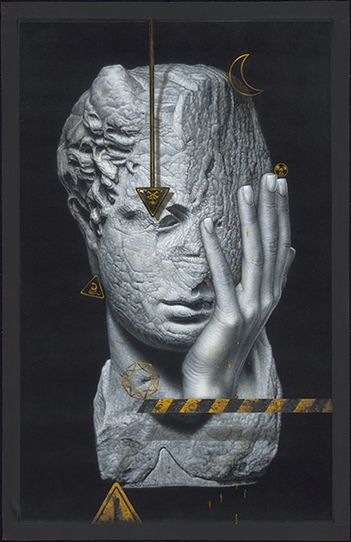In “Immortal,“ Ventura disrupts the idea of beauty as fixed or eternal. The fragmented bust (its features worn down by time) is interrupted by a hand that feels too human, too now. Floating hazard symbols—bees, crescent moons, radiation signs—surround the figure like a low-grade warning. There’s a softness in the gesture, but also tension: a face half-seen, half-shielded, caught between erosion and care. Ventura isn’t interested in ideal beauty; he’s tracing its breakdown. What remains is delicate, unsteady: less a monument, more a question. Can beauty still offer shelter in a world already soaked with threat?