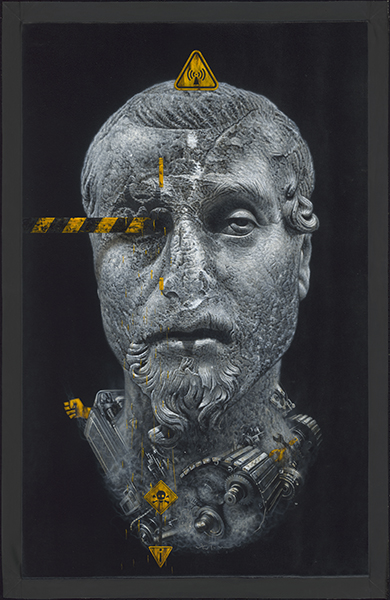 在《不朽》系列中,〈力量〉呈現出飽受破壞的樣態。頭像是古典風格——堅毅、雕琢過——卻裝配著機械殘骸:齒輪、電纜、警示膠帶。一隻眼睛消失了,取而代之的是生物危害標誌。這座半身像所展現的並非權威,而更像是存活。作者呈現的「力量」並非主宰,而是在壓力下組合而成的事物:部分神聖,部分是殘餘。沒有純粹的假象。這是個被重建、修補、為了持續運作而存在的人物。神性已被重新佈線了。其結果更像是半機械人而非聖人,介於崩潰與控制之間。