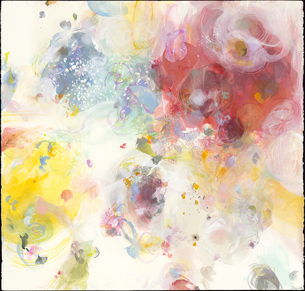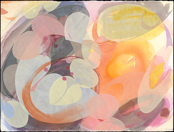 In this painting I have collaged painted Shoji paper using cut organic shapes to explore the dynamic contrast between crisp edges and softer, fluidly painted areas.